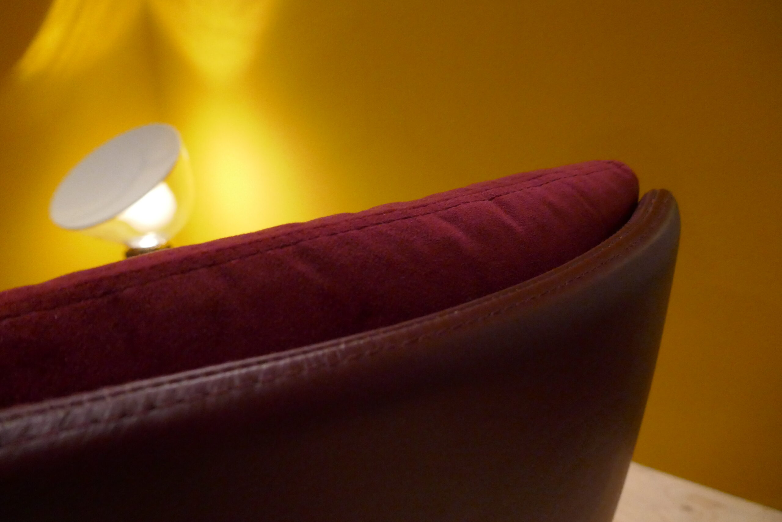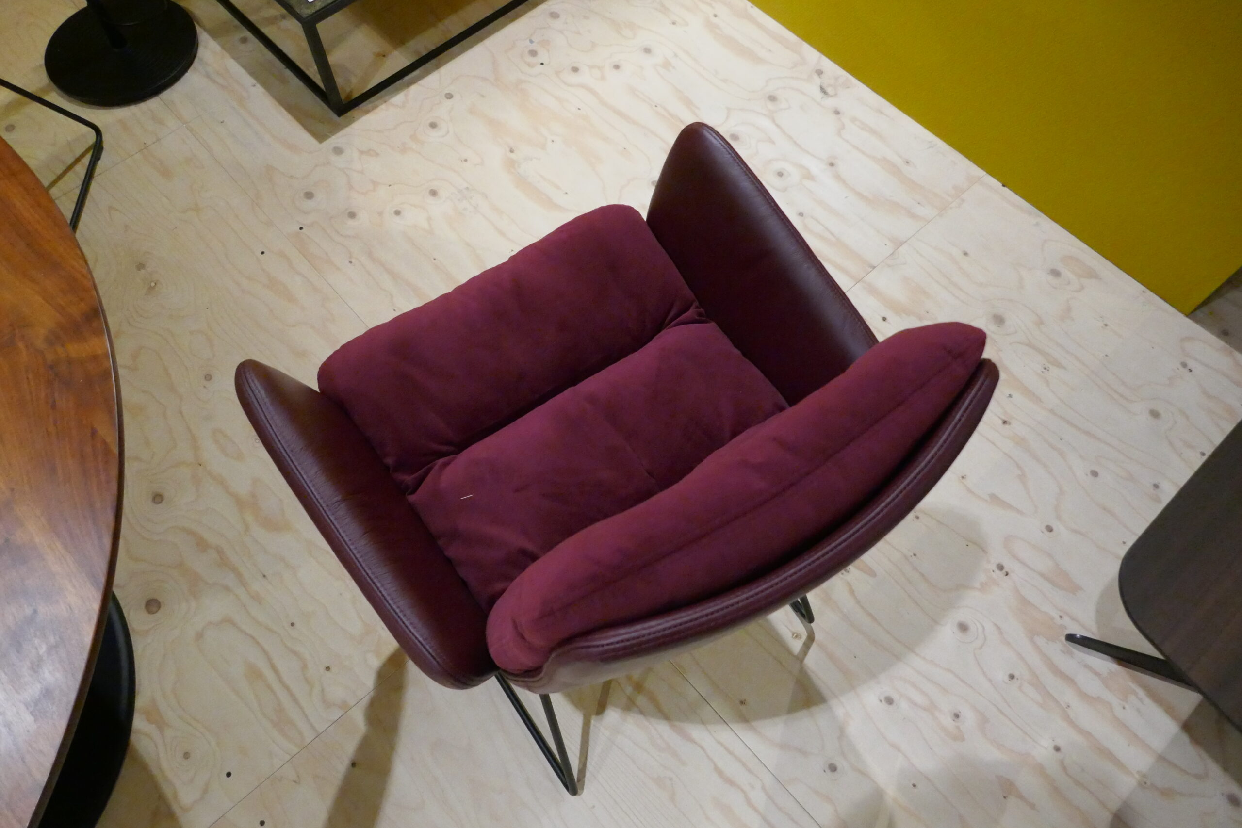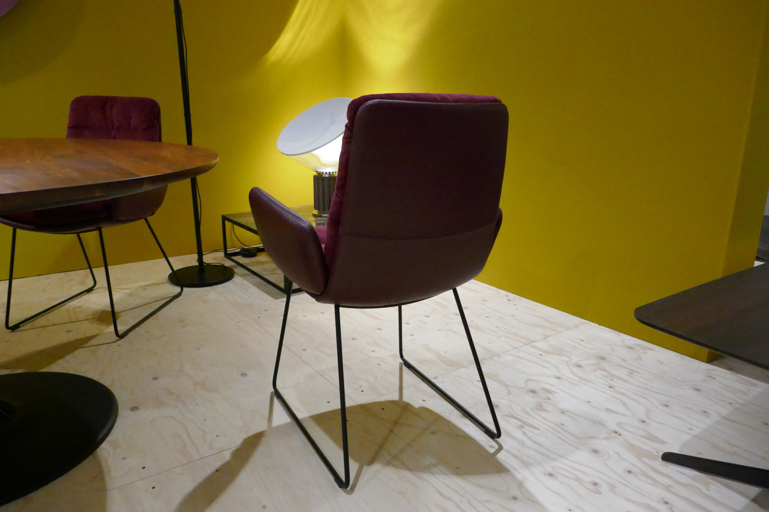 Donkerrode eetkamerstoelen in duostoffering met zwarte sledes.